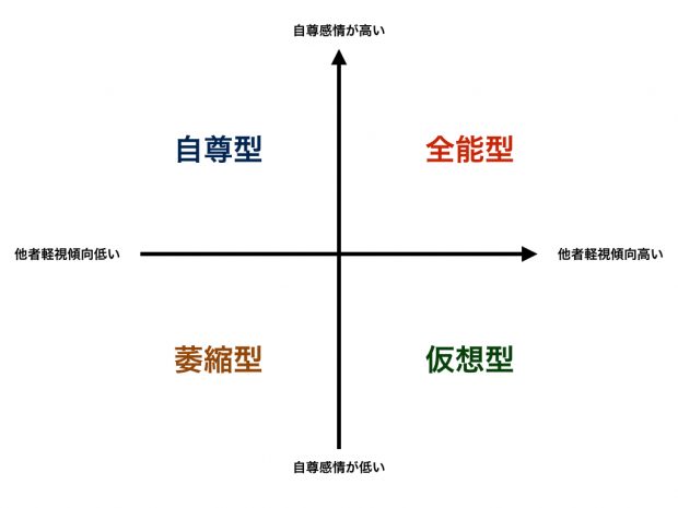 自尊感情の高低と他者軽視傾向の高低で表を作り、4つのタイプに分類しました。