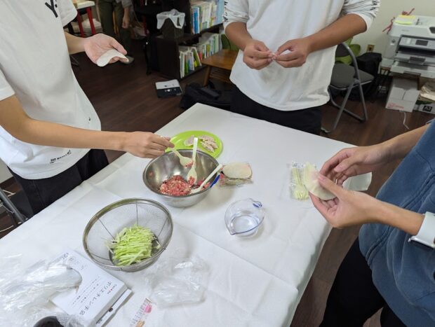 キャベツを切り、お肉、調味料を混ぜて包む工程、全て生徒たち担当です。